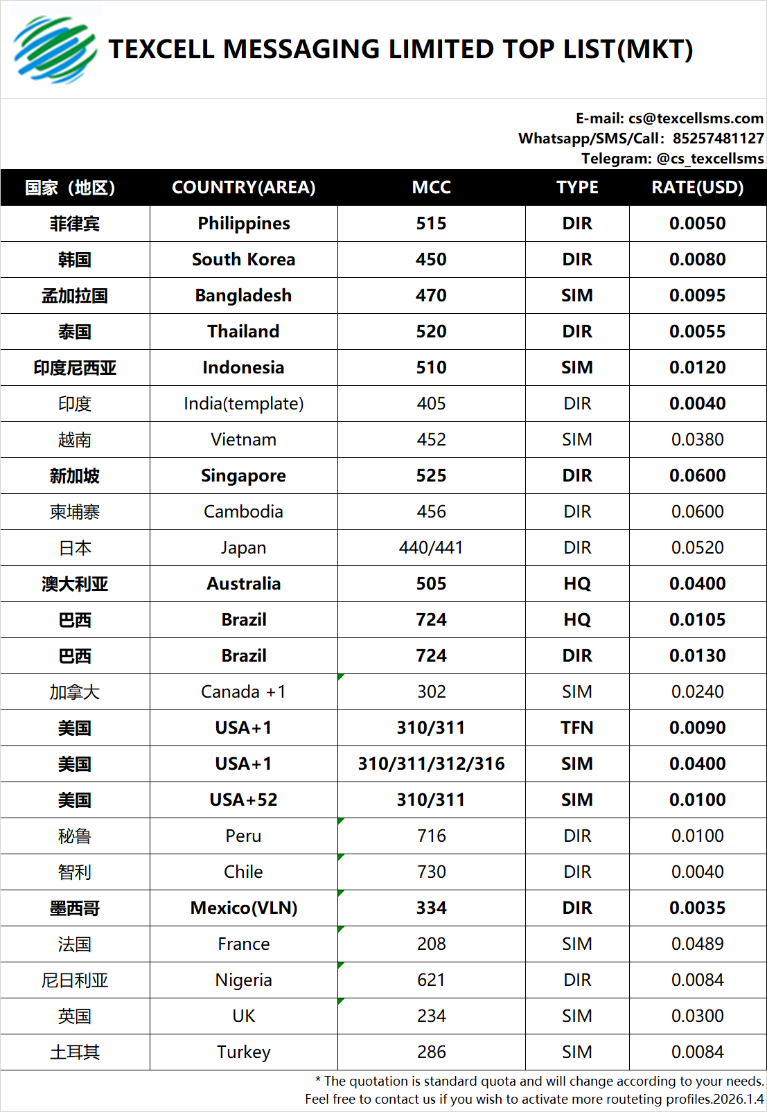 TEXCELL MESSAGING LIMITED's local direct SMS routes in Brazil, the Philippines, Australia, Mexico, and Thailand rely on a high-performance architecture with its own data centers and direct local connections, ensuring secure and stable data transmission and easily handling massive concurrency. We deeply integrate with the networks of major local operators in various countries, providing services with broad coverage, high-speed delivery, and high compatibility, precisely meeting the high-frequency communication needs of e-commerce, finance, social media, and lifestyle services in different regions. Choosing us will give you superior local connectivity, regulatory-compliant high reliability, and flexible, customized solutions in key global markets, providing strong communication support for your international business expansion.